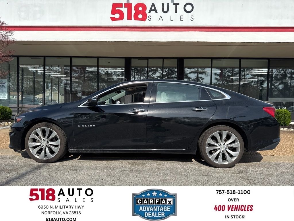 *NAVIGATION*, *SUNROOF*, *LEATHER*, *150 POINT INSPECTION*, *3 MO 3000 MILE SERVICE CONTRACT ON MOST CARS SEE SALES FOR DETAILS*, *518AUTO.COM*, *CALL ALEX NOW 757-518-1100 FOR BEST DAILY PRICE*, *FRESH DETAIL*, *FRESH OIL CHANGE*, *MUST BRING IN AD TO GET SPECIAL INTERNET PRICE*, *NEW STATE INSPECTION*, *https://www.facebook.com/518Auto/#*, *PRINT OUT TO GET THIS PRICE*, *DEALER TRADE-IN*, *CLEAN CARFAX*, *20 SERVICE RECORDS*, *SERVICE RECORDS AVAILABLE*, Malibu Premier, 4D Sedan, 2.0L 4-Cylinder DGI DOHC VVT Turbocharged, 9-Speed Automatic, FWD, Mosaic Black Metallic, Dark Atmosphere/Medium Ash Gray w/Perforated Leather-Appointed Seat Trim, Navigation System.