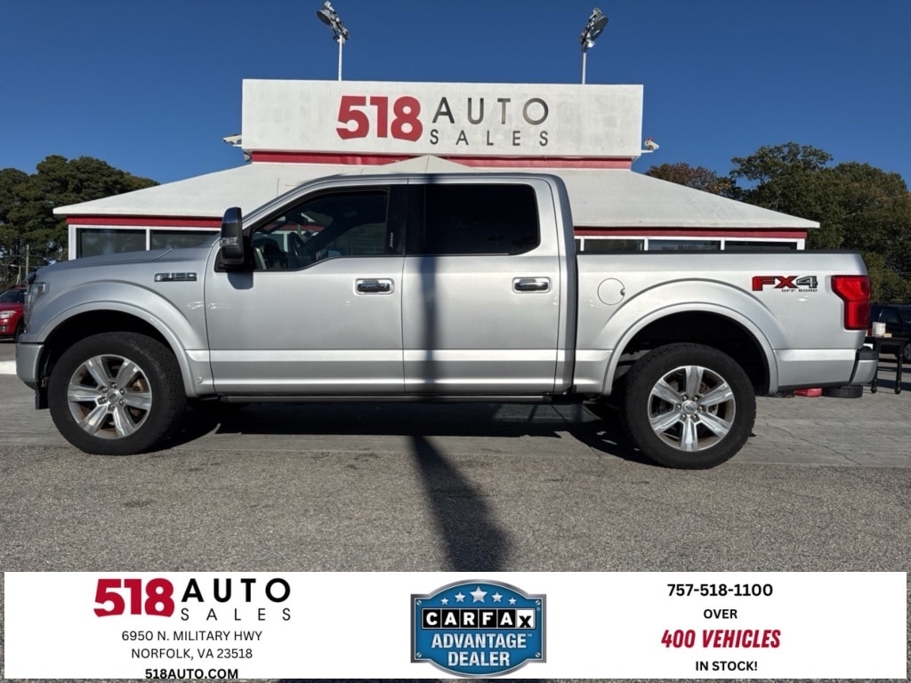 *NAVIGATION*, *LEATHER*, *150 POINT INSPECTION*, *3 MO 3000 MILE SERVICE CONTRACT ON MOST CARS SEE SALES FOR DETAILS*, *518AUTO.COM*, *CALL ALEX NOW 757-518-1100 FOR BEST DAILY PRICE*, *FRESH DETAIL*, *FRESH OIL CHANGE*, *MUST BRING IN AD TO GET SPECIAL INTERNET PRICE*, *NEW STATE INSPECTION*, *https://www.facebook.com/518Auto/#*, *PRINT OUT TO GET THIS PRICE*, *DEALER TRADE-IN*, *CLEAN CARFAX*, *20 SERVICE RECORDS*, *SERVICE RECORDS AVAILABLE*, F-150 Platinum, 4D SuperCrew, 3.5L V6 EcoBoost, 10-Speed Automatic, 4WD, Ingot Silver, Black Leather.